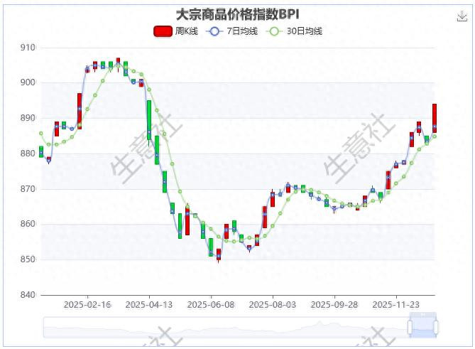 12月26日大宗商品价格指数BPI为894点,较 周初 上升了 8 点,较周期内最高点1343点(2021-10-19)下降了 33.43% ,较年内最低点849点(2025-06-11)上涨了5.30% 。