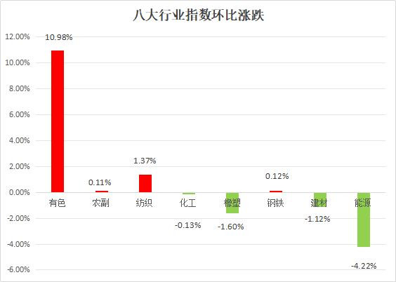 生意社监测的8 个行业,本周涨多跌少,上涨前三的分别是有色行业,涨幅为2.65%,农副行业,涨幅为0.97%,纺织行业,涨幅为0.82%。下跌的分别是能源行业,跌幅为-1.12%,建材行业,跌幅为-1.12%,钢铁行业,跌幅为-0.12%。